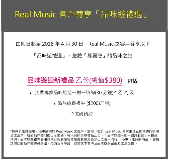 由即日起至2018年4月30日,品味旅者尊享 免费Real Music 小童声乐评估 乙次,以及以九折优惠首次试学乙次(小组课程,共8堂) !