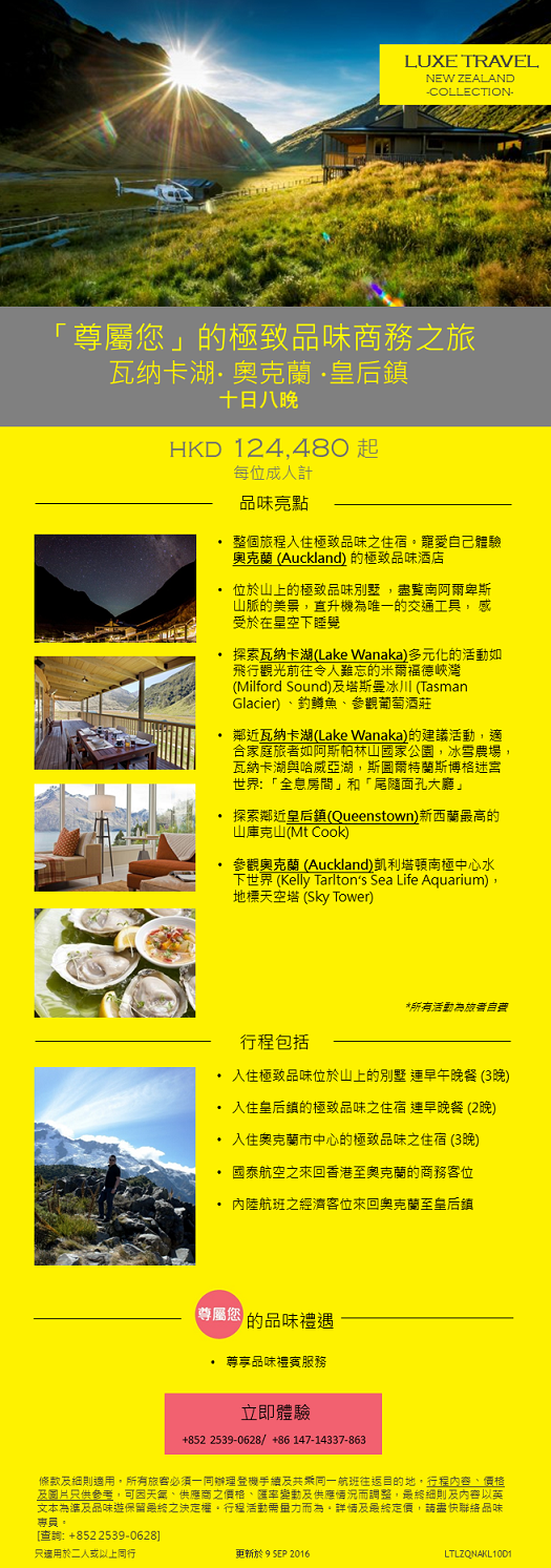 *條款及細部: 價格包括來回經濟倉機票及酒店,有關稅項及燃油附加費不包括在內,不適用於指定日子包括香港及目的地之長假期、公眾假期、特別日子及展覽時段。「極緻品味紐西蘭慢活體驗」10天之旅以最少10人同行計。價格可因供應商之價格及匯率變動、機位及酒店之供應情況而調整,煩請聯絡我們以提供即時報價。如有任何爭議,以英文本為準,品味遊保留最終之決定權。